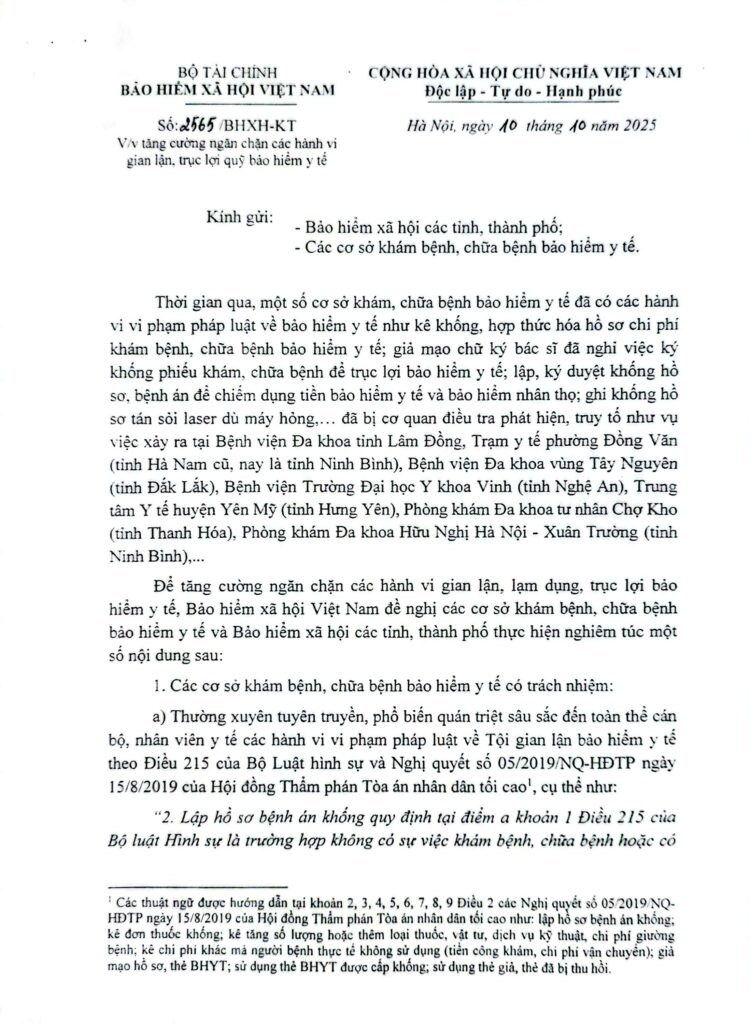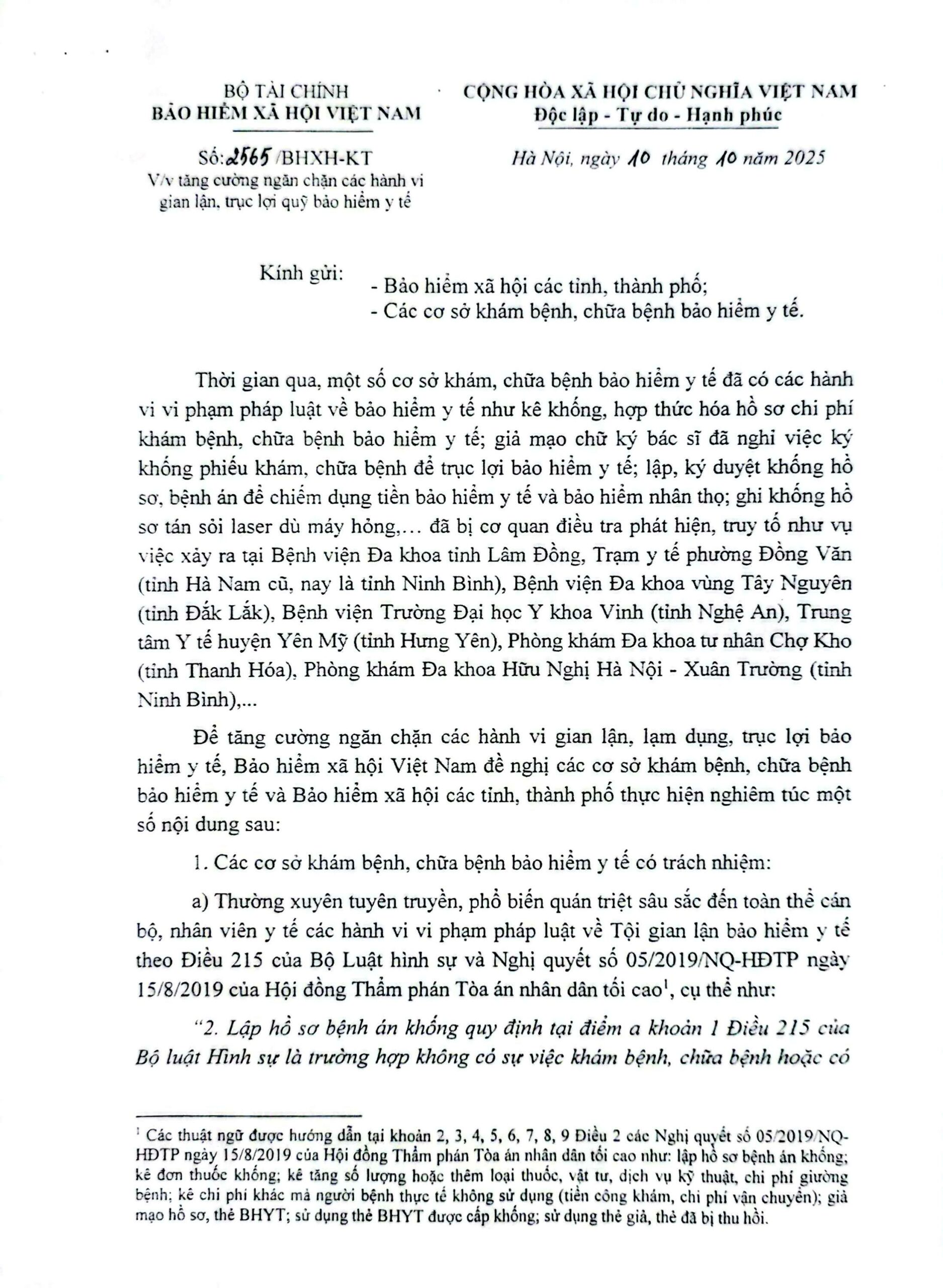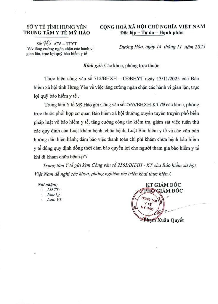 Công văn số 465 /CV_TTYT 14/11/202514/11/2025 admin V/v tăng cường ngăn chặn các hành vi gian lận, trục lợi quỹ bảo hiểm y tế Công văn số : 2565/BHXH-KT đi kèm theo Hướng dẫn quy trình kỹ thuật về Tiết niệu – tập 1.1 Công văn số: 463/CV-TTYT